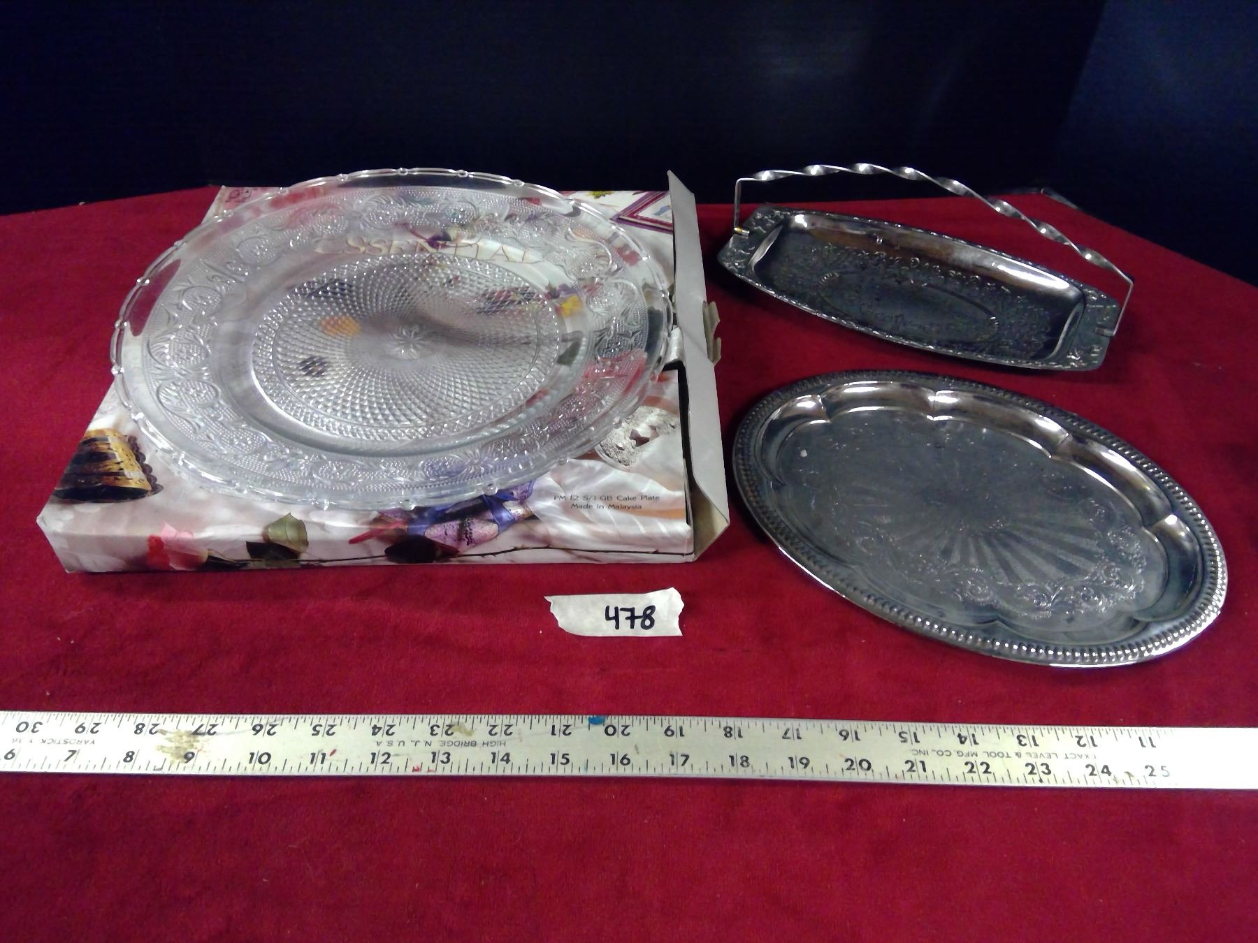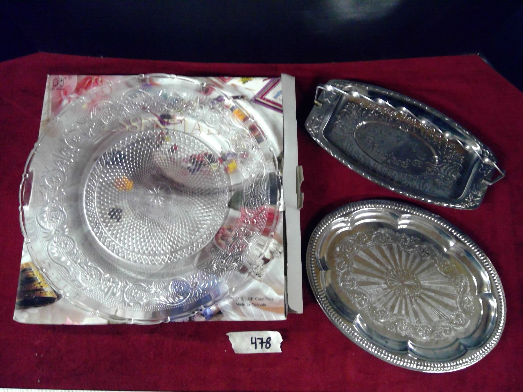 1-Essentials 12 inch Cake Plate Glass; 2-Decorative metal plates