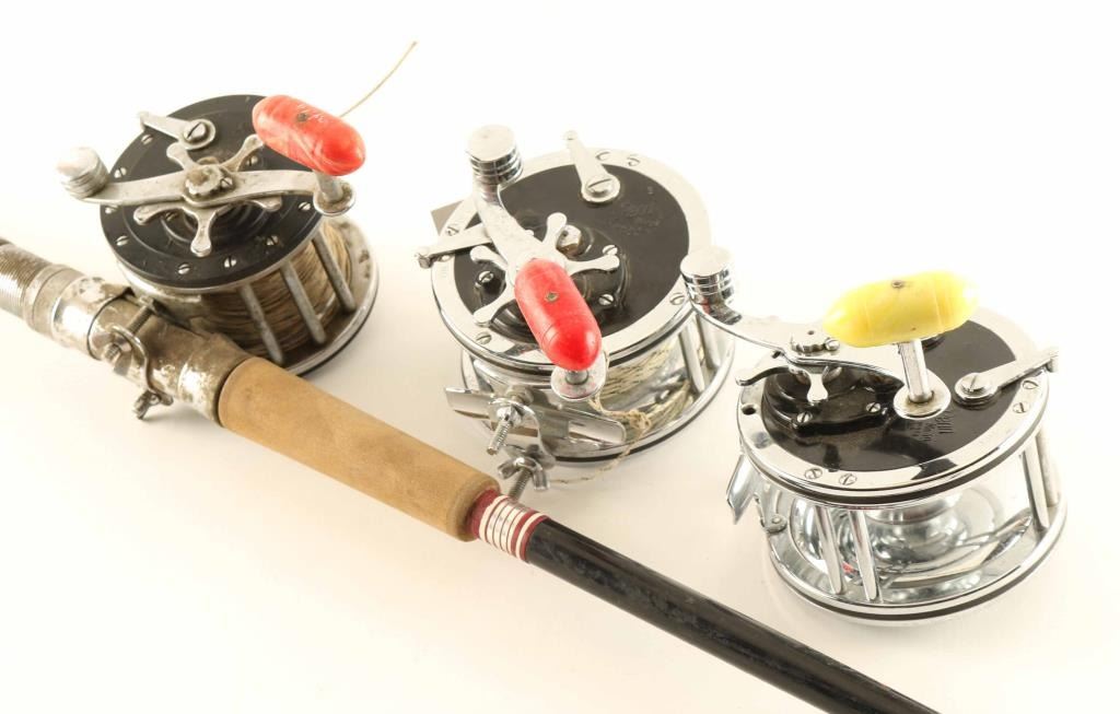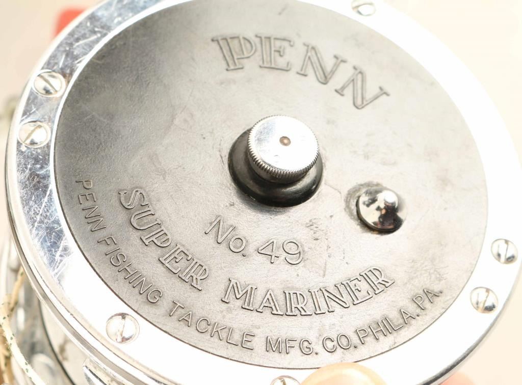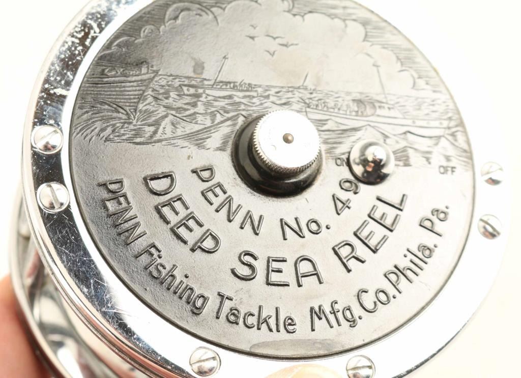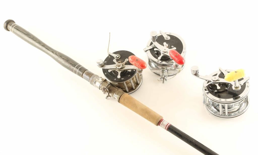 (2) Penn No. 49 reels, one Super Mariner, with line, the other Deep Sea Reel both in good condition. Garcia approx. 78"l pole with a Penn No. 33 Long Beach reel with line. Pole shows use and wear.