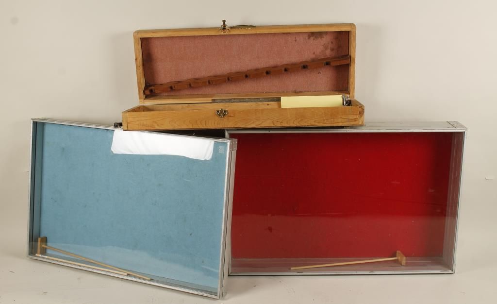 First is a 32" by 21" by 2-5/8" aluminum box with glass top made by Jomar. Second is a 32" by 21" by 4-5/8" aluminum box with glass top made by Jomar. Third is for displaying rifles and is a breakdown style hinged wooden box with support extensions inside.