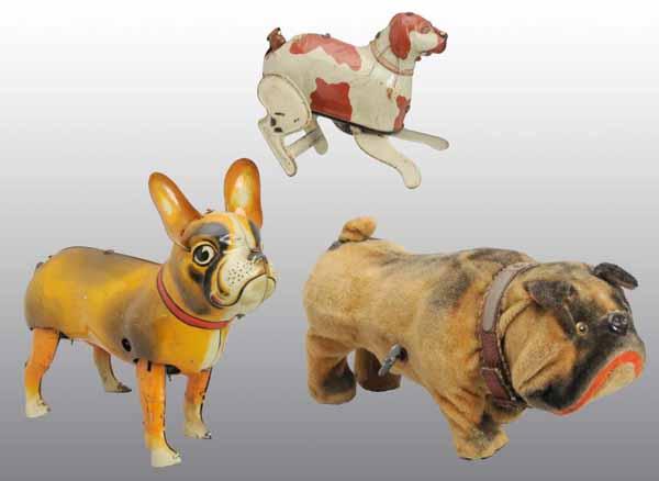 Description German. Working. Includes one fur-covered and two tin toys. One toy is marked "SG Made in Germany" and one toy is marked "Made in Germany US Zone. Condition (Very Good - Excellent). Size Largest: 9" L.
