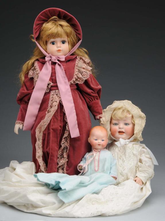 Description Largest is a relatively new doll with bisque head and hands. Maker is unknown. Also includes a Hertel & Schwab 152 character baby on composition body and an Armand Marseille 351 baby with cheek rubs. Condition (Good).