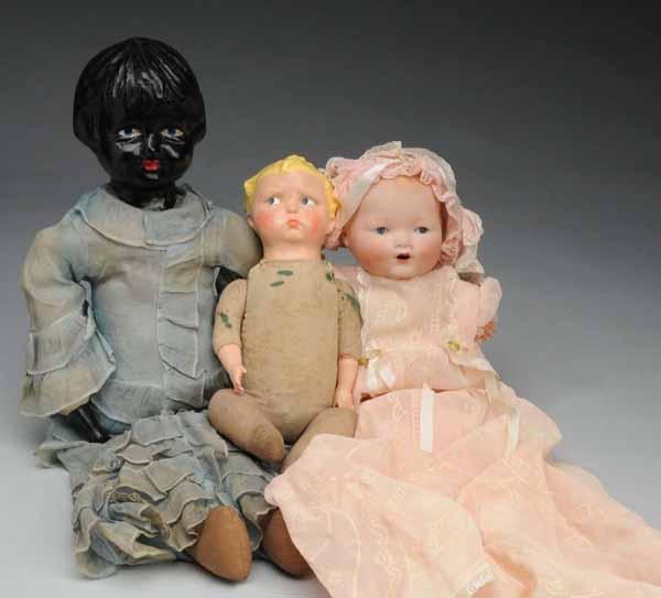 Description Bisque socket head incised "Arranbee", sleeping eyes, open mouth with one tooth, vintage cloth body with celluloid hands. Effanbee composition early Baby Grumpy (fully restored head). Black composition head with bobbed molded hair, painted features, original cloth body, tiny compo lower arms, organdy dress (soiled). Together with a pink lace and ribbon trimmed christening dress and hat for a 1950s baby doll. Condition (Very Good).