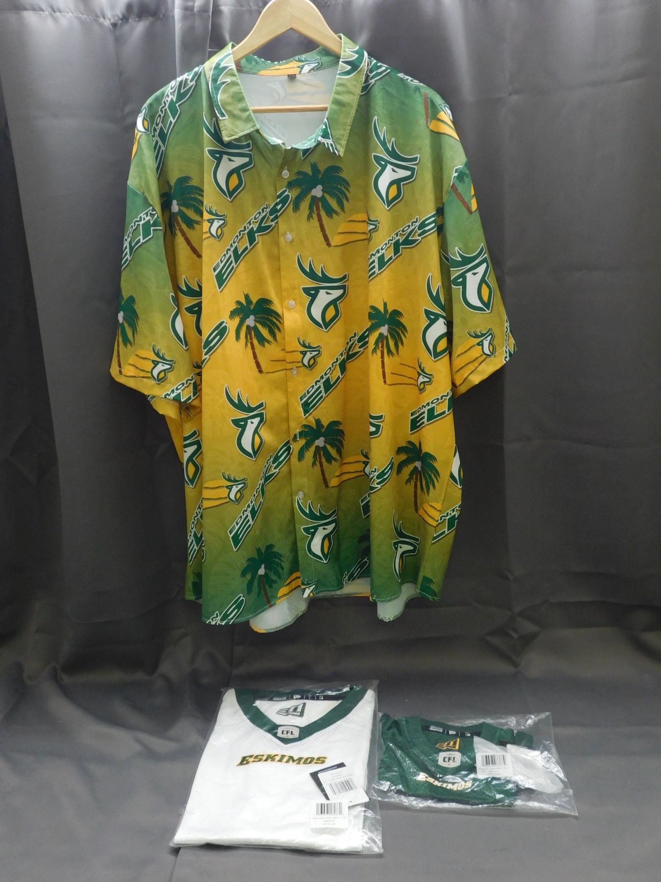 Lot of 3 Edmonton Elk Button Up Size 5X & Eskimos Shirts CFL Size L and 12M Child.