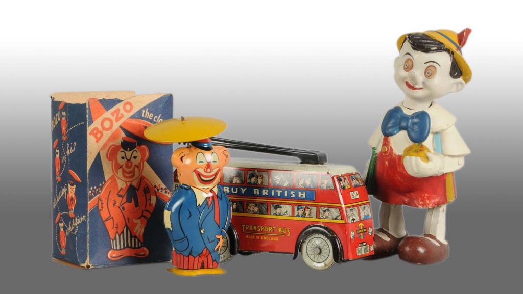 Working. Includes Walt Disney French composition Pinocchio walker, tin French Joustra Bozo the Clown with original box and English Wells wind-up transport bus. Minor overall wear with detached top flaps to Bozo the Clown box. Condition (Very Good - Excellent). Size 8" T.