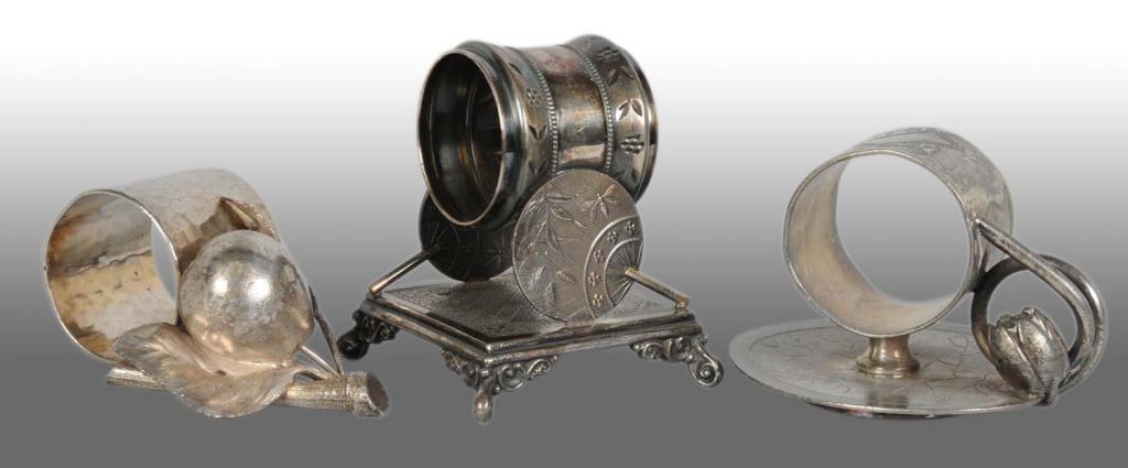 Includes a napkin holder with hammered finish on branches and leaves with large pear. This piece has no manufacturer's mark or number. Next is a napkin holder supported by two oriental fans on a square-footed base marked "Simpson, Hall, Miller & Co." and numbered "053". Last is a napkin holder on lily pad with lily bud and finger hold marked "Simpson, Hall, Miller & Co." and numbered "04". This piece may clean up a little but does have some silver loss. Condition (Good - Excellent).