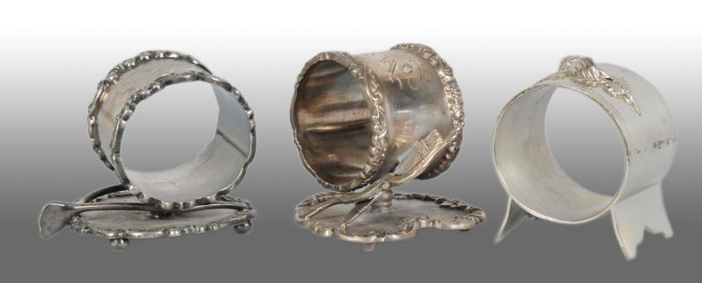 Includes a napkin holder engraved "Best Wishes" resting on wishbone on a round footed base. This piece is marked "Rogers & Bro" and numbered "4377" with some silver loss. Next is a napkin holder on heart-shaped base with bow and quiver of arrows. This holder is engraved "Best Wishes", is marked "Middletown Plate Co." and numbered "164". Last is a footed napkin holder embossed with hand holding flowers and leaves with no manufacturer's name or number. Condition (Very Good).