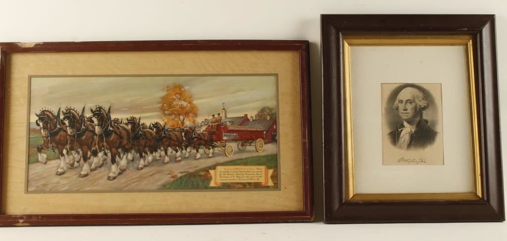 Old etching of George Washington-has tear in the middle, Genesee Brewing Company 12 Horse Team and the San Guinetti Race Horses. All in gold frames.