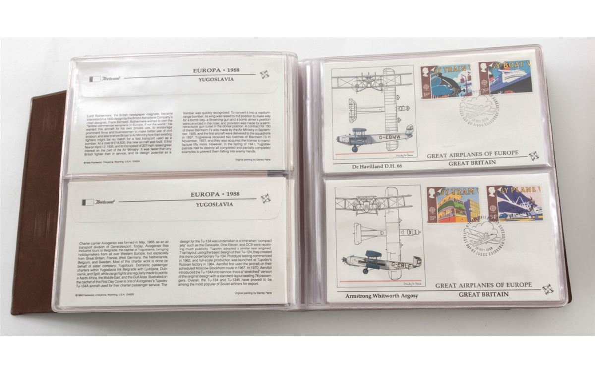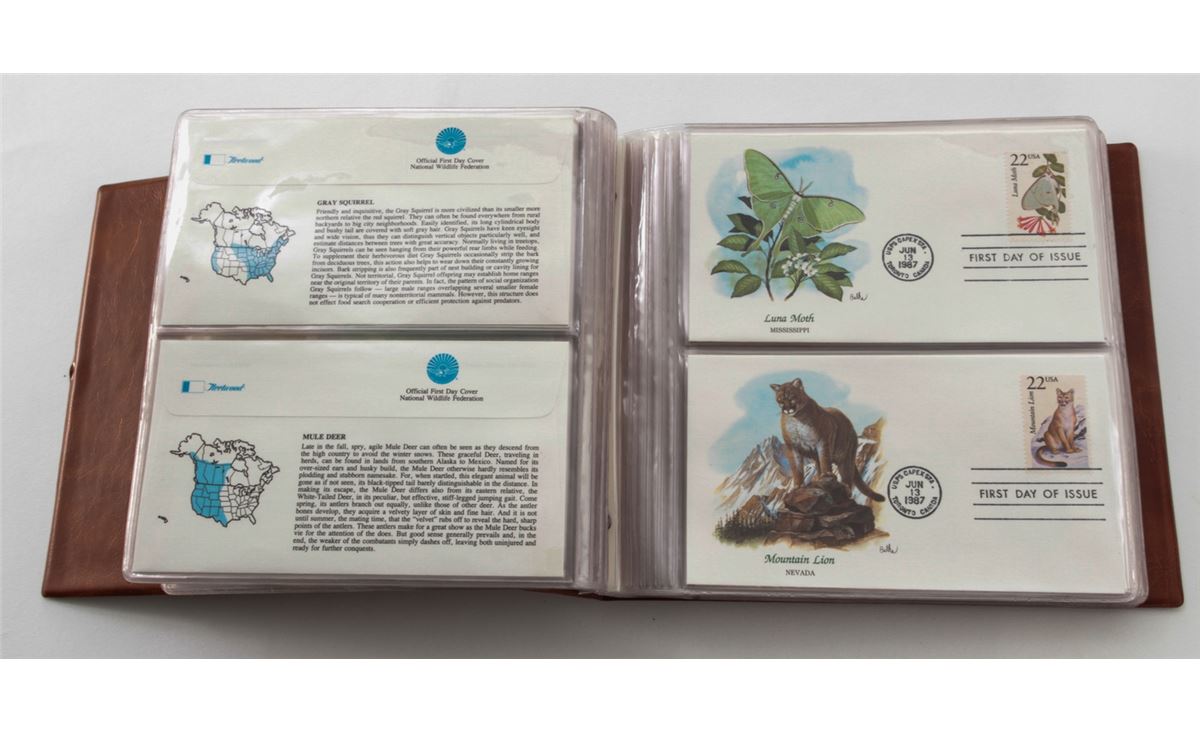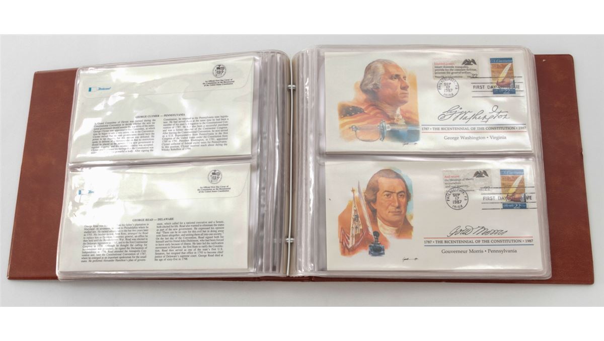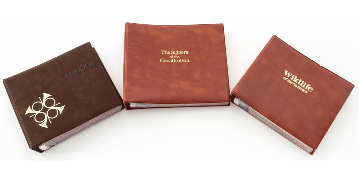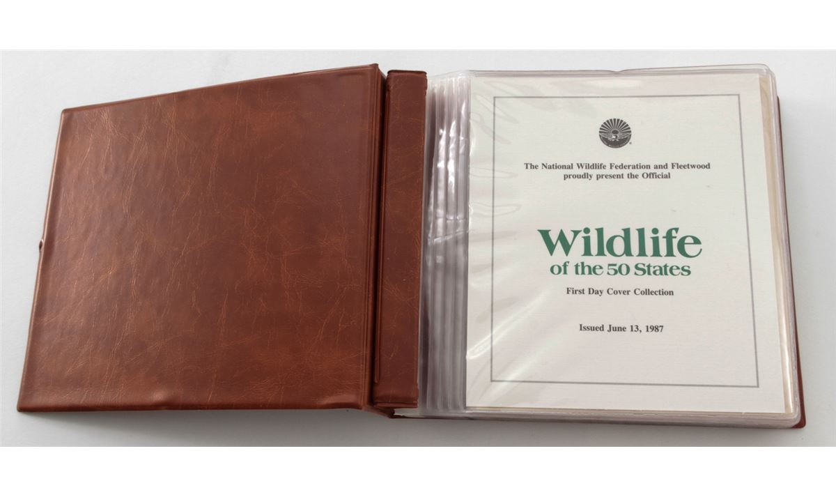 Lot of Three (3) First Day Cover Collections: (1) ''Great Airplanes of Europe'', by Fleetwood, over sixty (60) stamps, in bound book. (2) ''Wildlife of the 50 States'', by National Wildlife Federation, issued in 1987, in bound book. (3) ''The Signers of the Constitution'', by Fleetwood, in bound book. Condition to all is excellent, with detailed descriptions on each stamp. Est.: $100-$200/lot.