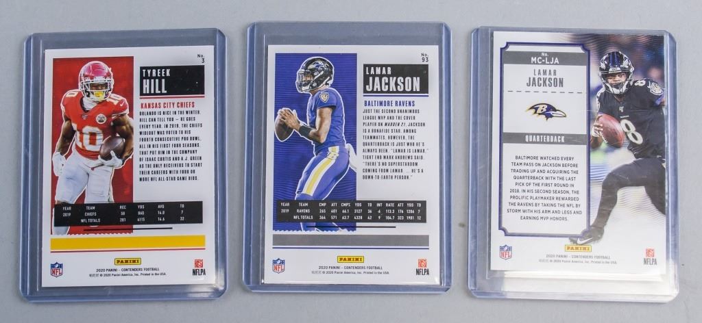 Lot of three football sports cards. Featuring one of Tyreek Hill and two of Lamar Jackson.