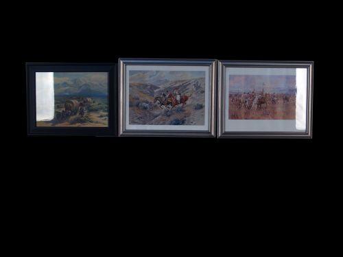 Lot of 3, Framed Charlie Russell Western Prints Cowboys roping a wolf...Lewis & Clark meeting the Flat Heads & a Wagon Train 16 x 20