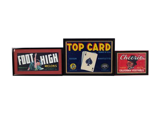 Lot of 3 Framed Produce Labels: Cheerio Vegetables--Foot-High Melons--Top Card Bartletts