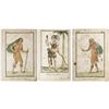 Lot of 3 French prints of Florida and California natives by Claude Louis Desrais and engraved by Jean Marie Mixelle (circa 1788), hand-colored and matted for framing. Florida print: outside 8-1/2" x 11", inside 4-3/4" x 8"; California prints: outside 8-1/2" x 11", inside 4-1/2" x 7". Engravings of a male Florida native in hunting garb and both male and female California natives in working apparel, browned paper in very fine condition.