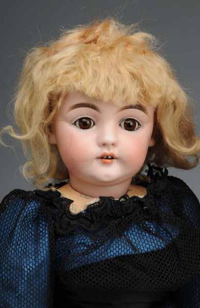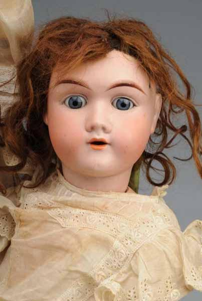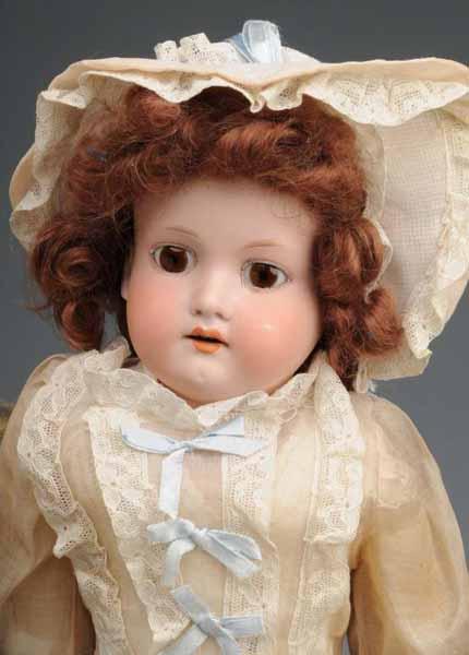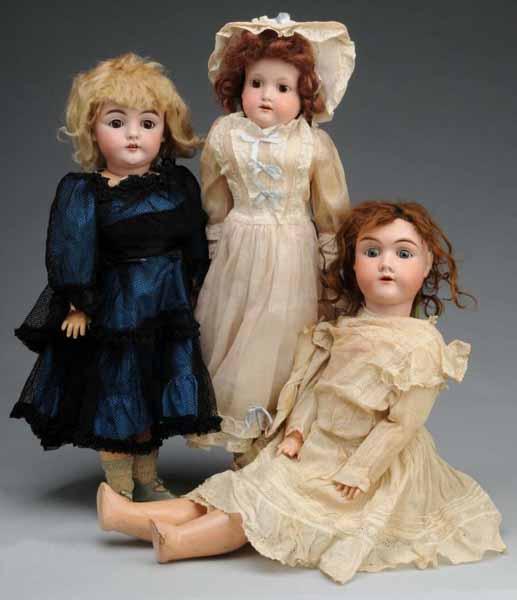 Description Ca. 1910. Bisque socket head incised "Max Handwerck", sleeping eyes, no teeth, original wig and clothes (dress torn), jointed composition body needs stringing. Bisque socket head 143 for J. D. Kestner (head broken and glued all around and through the face), original mohair wig (glued down tightly), sleeping eyes, open mouth with two teeth, jointed composition body with original undies, shoes and socks. Bisque shoulder head incised "A.M. 370", set eyes, mohair wig glued tightly down, kid body (some patches) with composition lower arms, dressed. Condition (Fair - Good). Size Largest: 23" T.