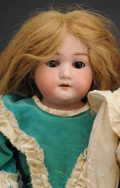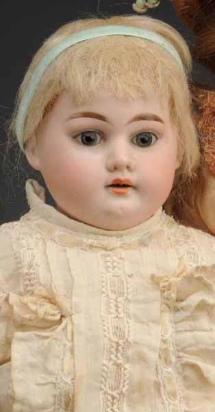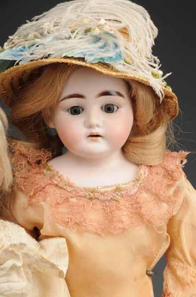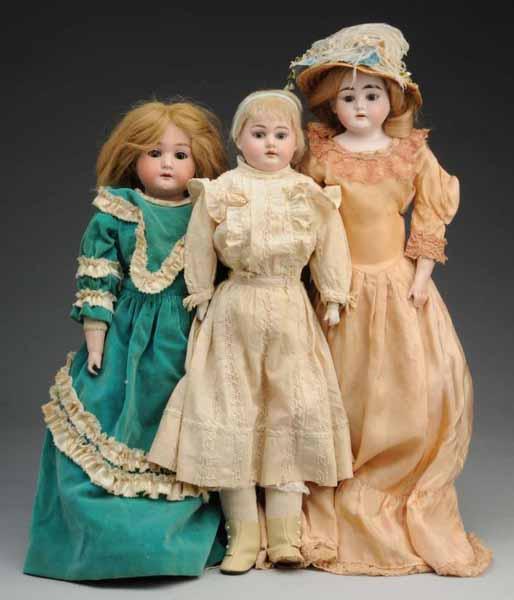 Description Ca. 1900. Bisque shoulder head incised "Florodora A 3 M", replaced human hair wig, sleeping eyes, kid body with bisque lower arms (body torn and sawdust leaking), dressed. Bisque shoulder head (hairline on back of head), sleeping eyes, replaced wig, kid body with bisque hands, dressed with hat. Bisque shoulder head incised "3500" by Armand Marseille, set glass eyes, skimpy original wig, kid body with bisque lower arms, lovely vintage dress. Condition (Good). Size Largest: 23" T.