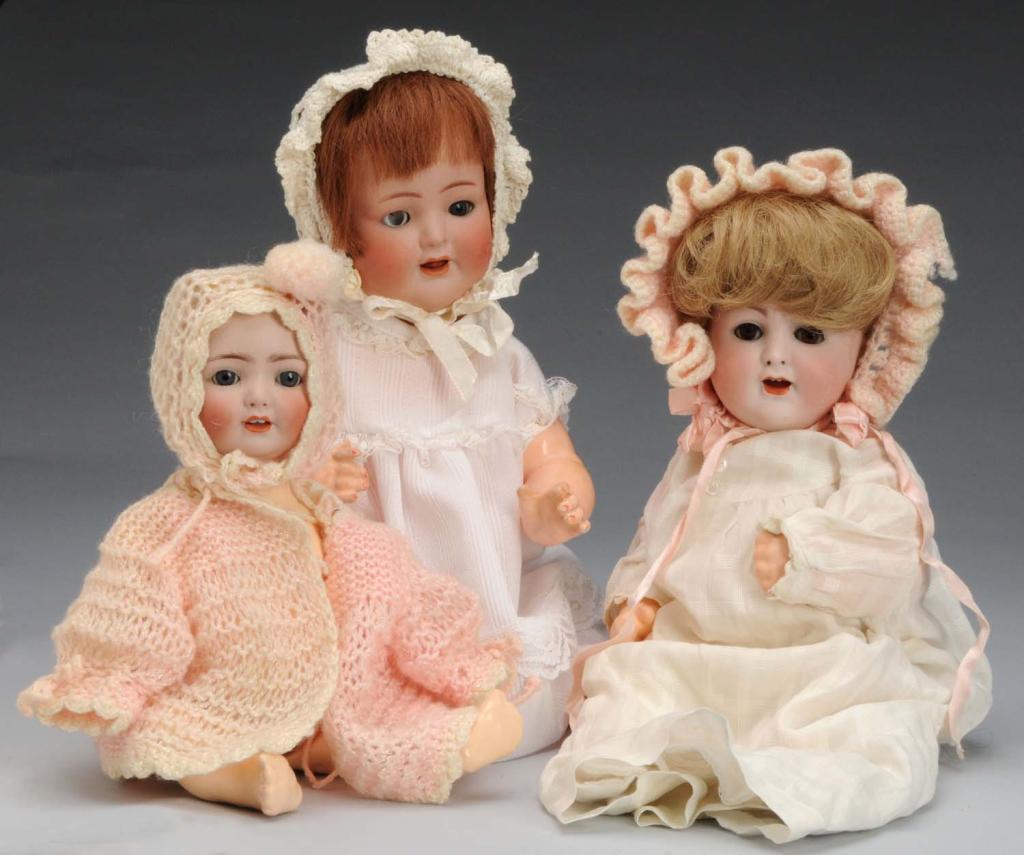 Description Largest is a K*R 126 doll with glass sleep eyes, open mouth with teeth, and center of right eyeball missing. Also includes an ABG 1361 doll with brown glass sleep eyes, open mouth with teeth, and a repainted body. Last is a Franz Schmidt baby with blue glass sleep eyes, open mouth with teeth, and open nostrils on a repainted composition baby body. All dolls have some cheek rubs. Condition (Fair - Good). Size Largest: 13" T.