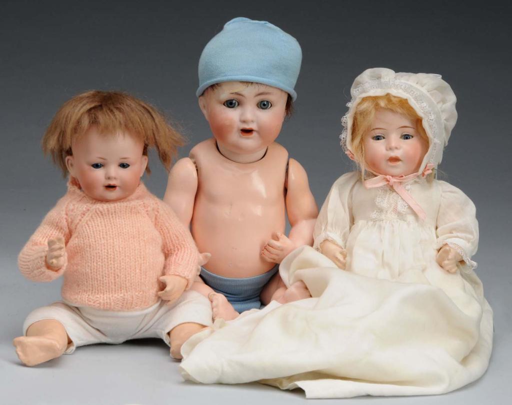Description Largest is a ABG 1361 doll with broken and glued head. Also includes a closed mouth baby incised "DIP" with head broken and glued. Last is a BP 585 character baby with glass sleep eyes. Condition (Poor - Very Good). Size 13" T.