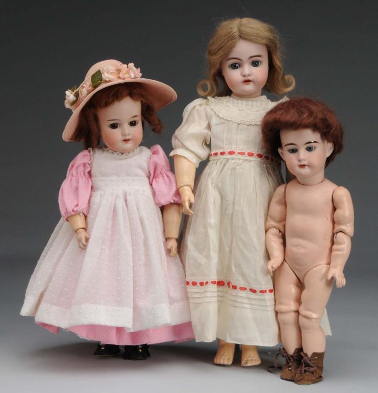 Description Largest is a 79 Handwerck doll on a jointed body with old mohair wig. Also includes a Paul Schmidt child doll on a German toddler body with fixed wrists and faint hairline on back of head. Last is an Armand Marseille 390 doll with brown glass sleep eyes, jointed body, and possibly replaced hands. Condition (Fair - Good). Size 17" T.