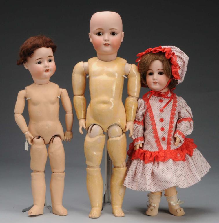 Description Largest is a Kestner doll incised "168" with brown sleep eyes and a fully-jointed wood and composition body. Also includes a doll incised "Germany B3" with brown glass sleep eyes and a fully-jointed painted body with repainted hands. Last is a doll marked "21 Germany R5A" with brown glass sleep eyes, jointed body with light overall repaint, and a hairline crack on forehead. Condition (Fair - Good). Size Largest: 25" T.