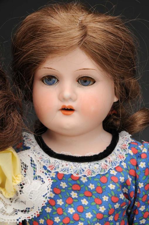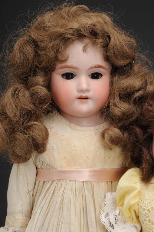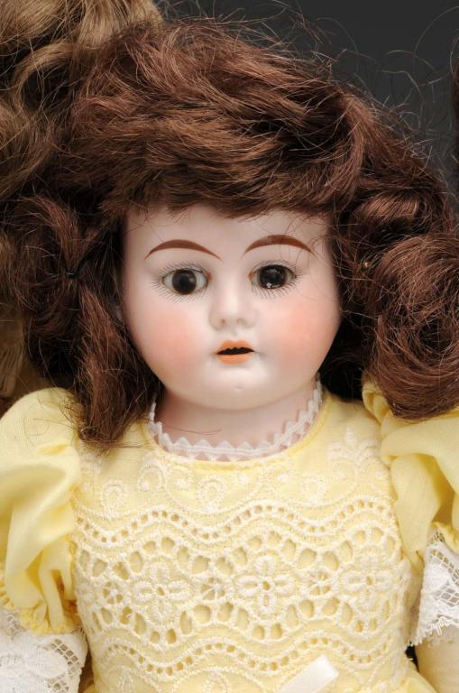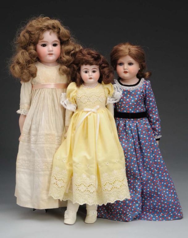 Description Largest doll is incised "AM370" with brown glass sleep eyes, cloth and leather body, and bisque forearms. Also includes another 370 doll with blue glass sleep eyes, cloth and leather body, and bisque forearms. Last is a smaller doll dressed in yellow with originally set brown glass eyes, open mouth with teeth, and incised on back of shoulder "L.W. & Co." with leather body and bisque forearms. All dolls have been re-wigged an redressed. Condition (Fair - Good). Size Largest: 19" T.