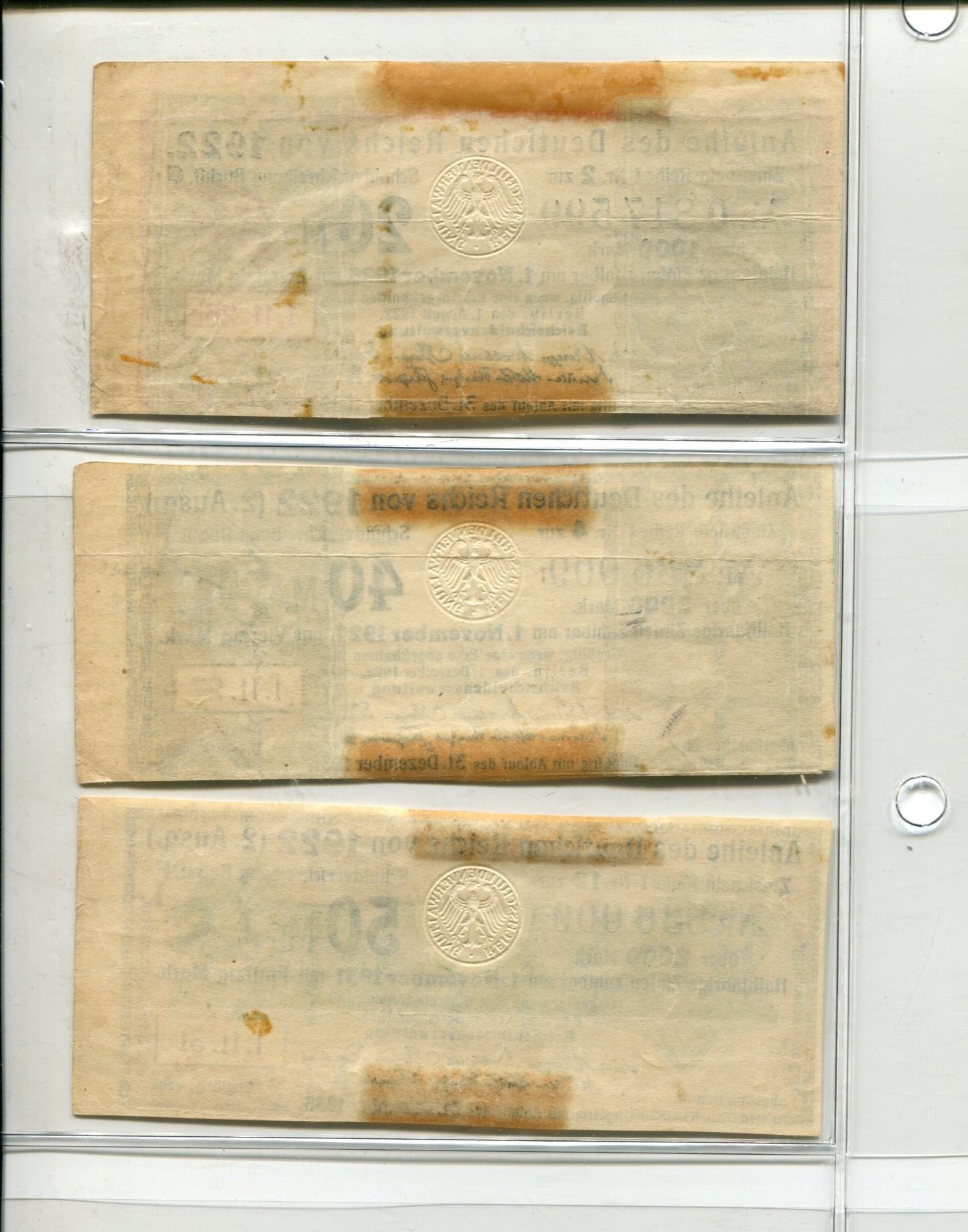 Lot of 3 German Reich Notes, all dated 1922: 20 Mark, 40 Mark & 50 Mark. VF+ with tape.