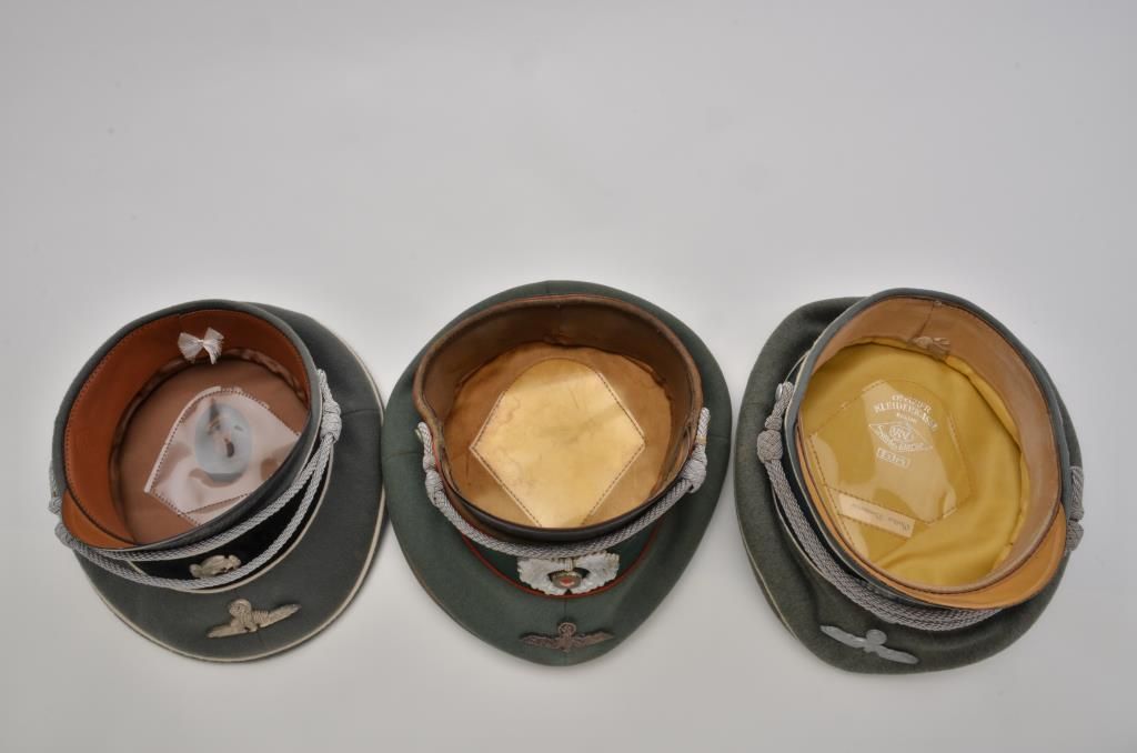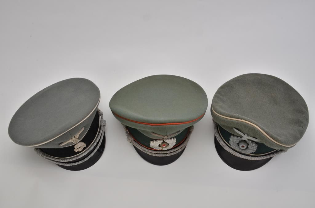 Lot of 3 German nazi military hats including an Infantry cap, an Artillery cap and an SS visor cap. Est.: $150-$225.