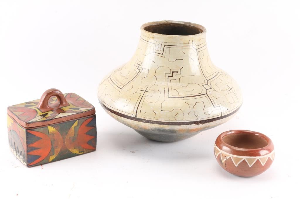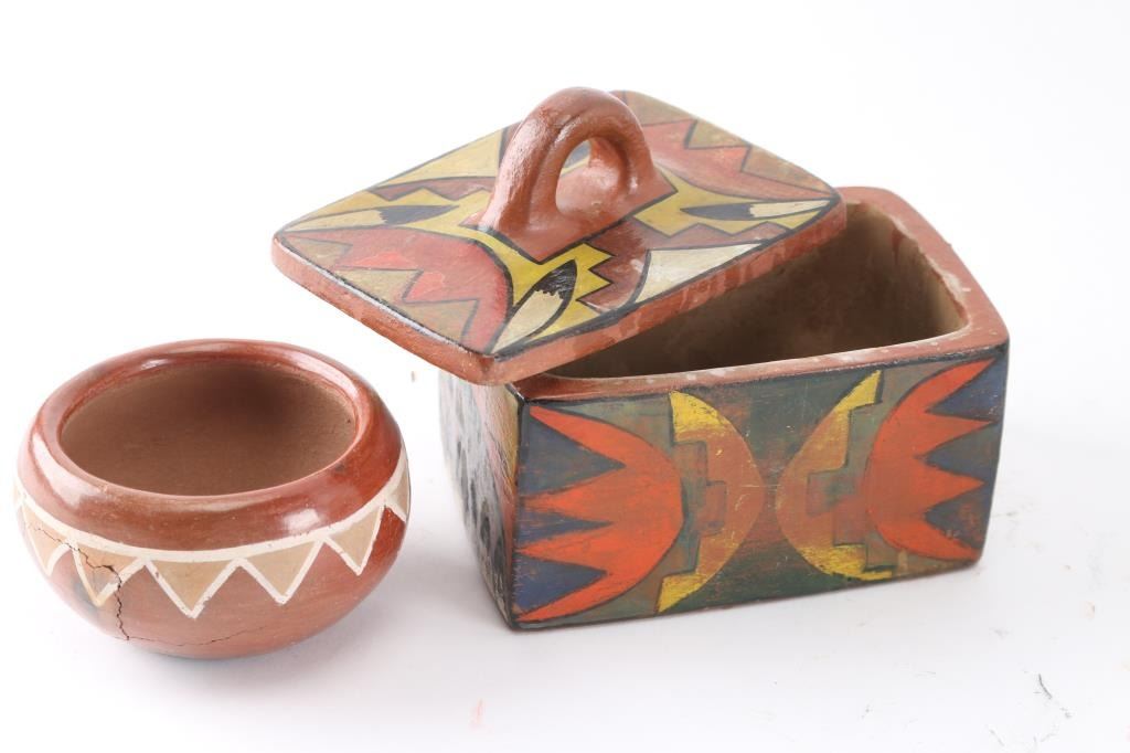 (1) Lidded box, brightly painted with symbols and feathers, measures 4 3/4" x 3 1/4".