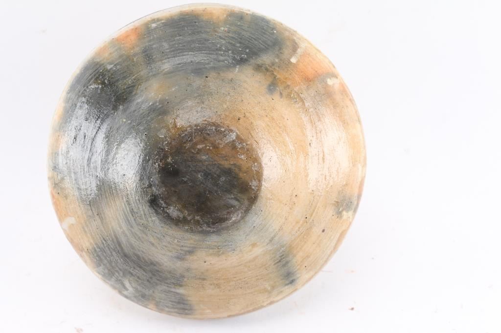 (1) Small pot, terra cotta glaze, with tan decoration, u-shaped crack.