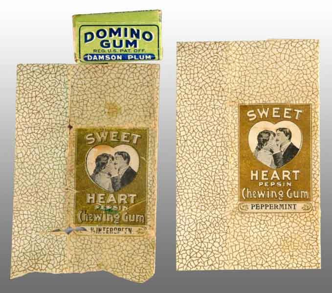 Description Includes one Domino Gum Damson Plum dated 1906 with one small tear, one Sweet Heart Pepsin Gum wrapper with pencil marks, and another Sweet Heart Pepsin Gum wrapper in a lesser condition value than the other. Condition (Good - Excellent). Size Largest: 3 - 3/4" x 3".