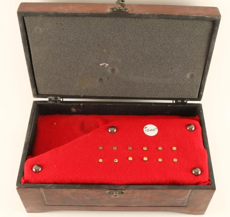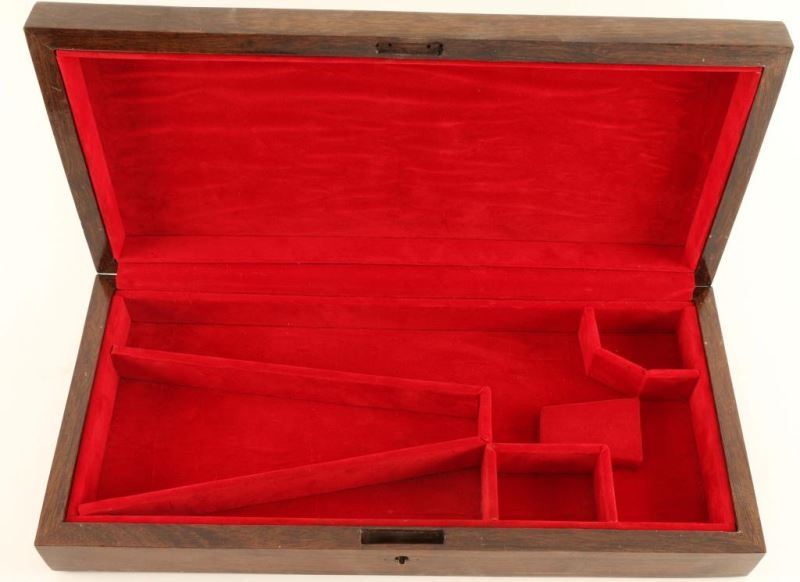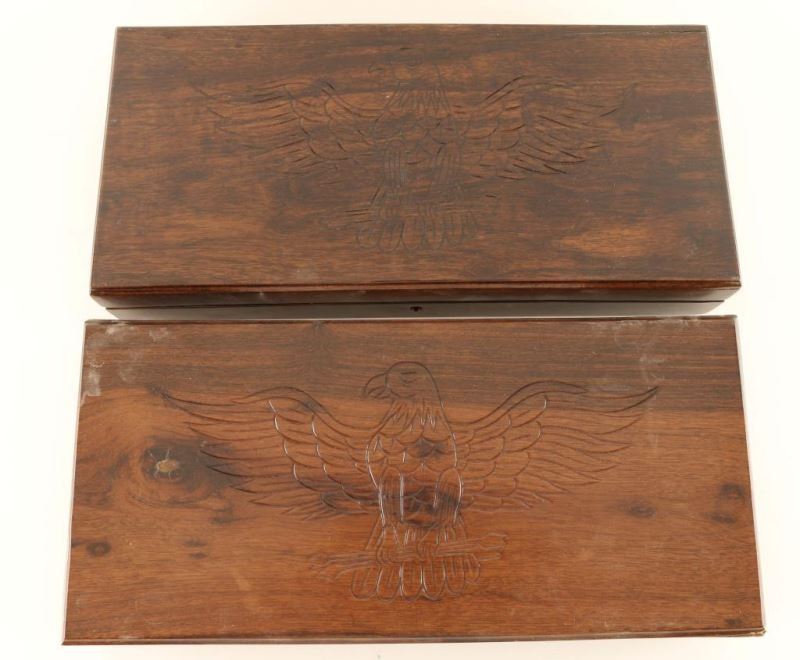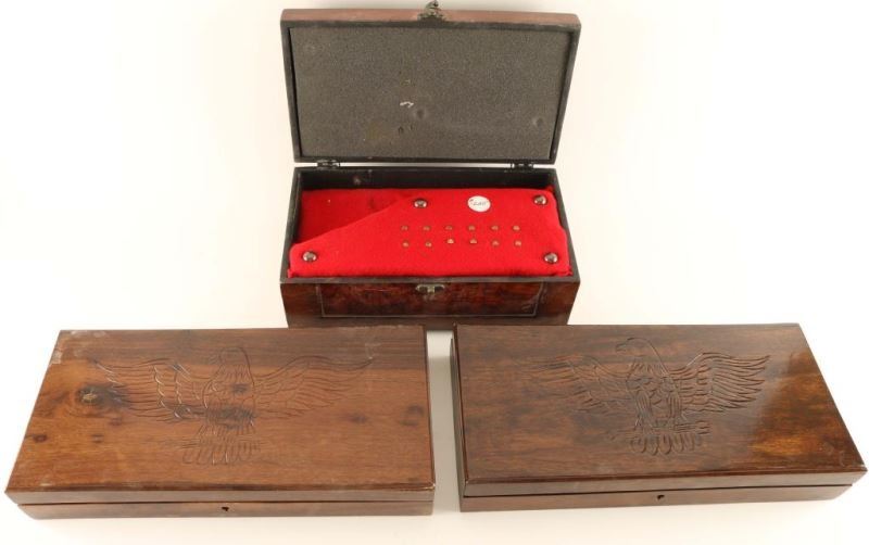 2 have eagle designs with red velvet interior, 1 is wooden treasure chest for revolver with 22LR bullets.