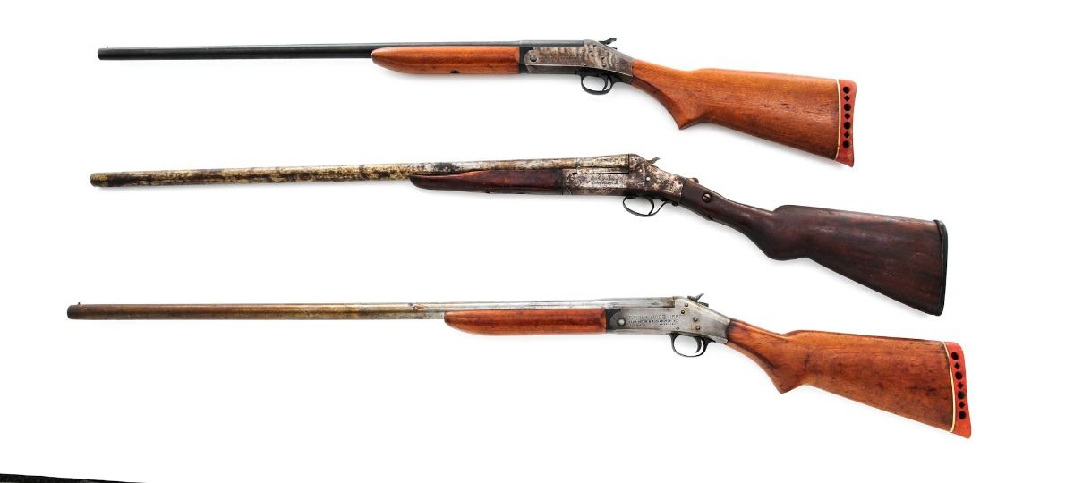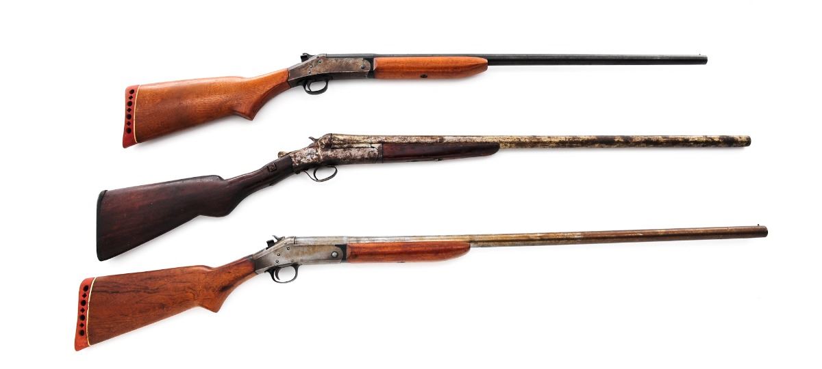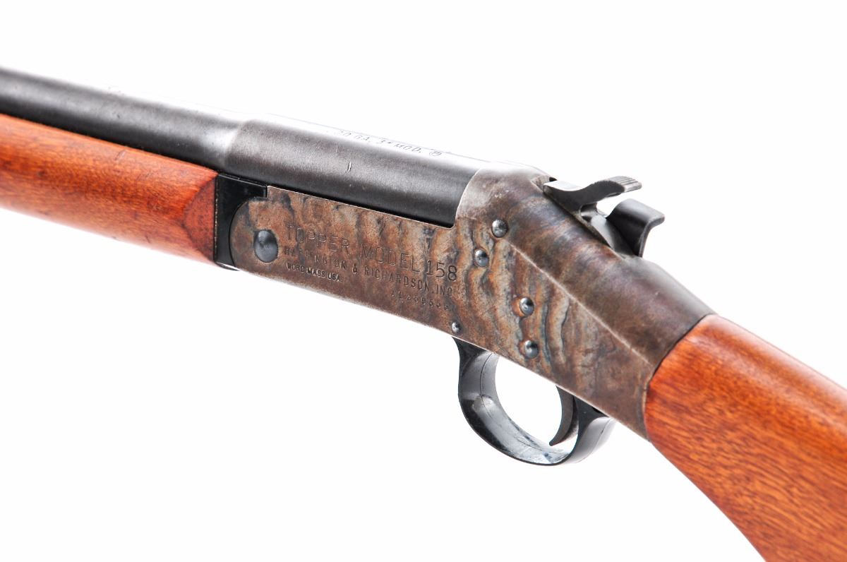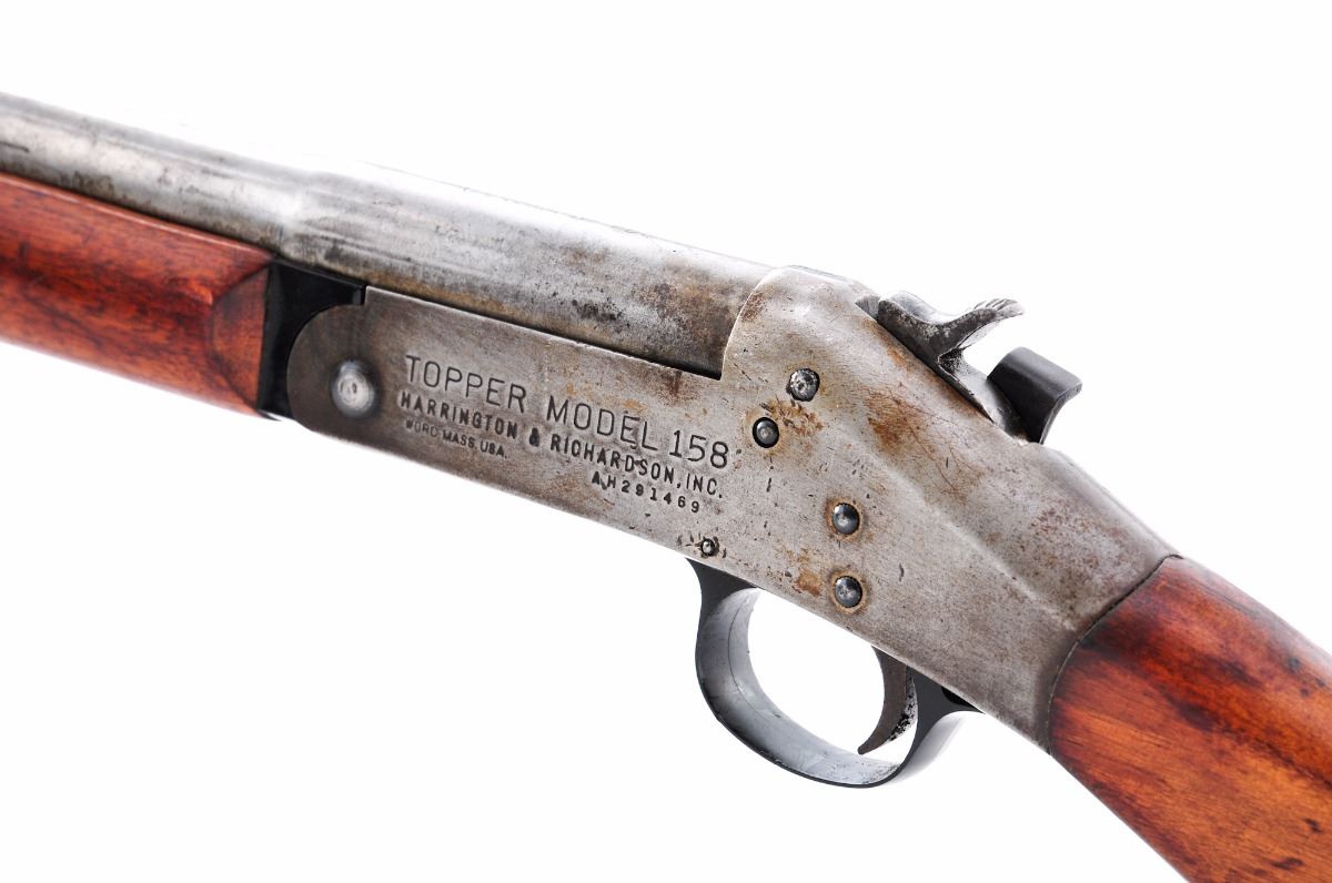 Lot of Three (3) Harrington & Richardson Single Shot Shotguns: (1) Topper Model 158, #AL259555, 20 ga. 3'' ch., 28'' blue barrel, case hardened receiver, pistol-grip walnut stock and forend, factory red rubber H&R recoil pad, with brass bead from sight. Condition is very good. Barrel retains approx. 95% thinning blue with scattered light surface rust. Receiver retains approx. 50% case coloring with dark spotting. Stock shows signs of sanding with an additional coat of oil added, as well as general dings and scratches. Action is crisp, bore is very good with the exception of corrosion near muzzle. Overall condition would improve with a thorough cleaning. (2) Topper Model 158, #AH291469, 12 ga. 3'' ch., 32'' barrel, originally blue and case hardened with small amounts of original finish remaining and has toned to an overall light gray with dark spotting; pistol-grip hardwood stock and forend, factory H&R hard rubber recoil pad, with brass bead front sight. Condition is good with virtually no original finish remaining. Stock has been sanded with thinning to the later-added varnish, as well as oil darkening, dings and mars. Action is crisp, bore is fine. (3) Enders Royal Cannon-Breech Single Shot Parts Gun, #2075, 12 ga., 30'' barrel. Condition is poor overall, being sold as a parts gun only. Est.: $150-$300/lot. (Modern)