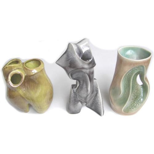 This listing includes three (3) ceramic works by Heifetz, including a vase in a shape reminiscient of the human heart, a masculine male torso figurine, and a more conventional vase. Specifications: heart, 4 lbs. 1 oz, 12 3/8 x 7 1/2 x 7 inches; torso, 4 lbs. 7 oz., 14 5/8 x 8 x 5 inches; vase, 4 lbs. 15 oz, 12 1/2 x 7 x 5 inches. There is a hairline on the top of the yellow/heart shaped piece, and a small chip from the base of this piece. There are no visible flaws to the other two pieces. The oval shaped vase still has its original paper label. (Unfortunately we failed to photograph the underside of this piece.) Heifetz is known primarily for their unique ceramic table lamps. These pieces were either produced as stand-alone artistic works or were pieces that were never drilled or mounted with lighting hardware. In our research we've found very few stand-along Heifetz ceramic pieces and thus believe these may be relatively rare.
