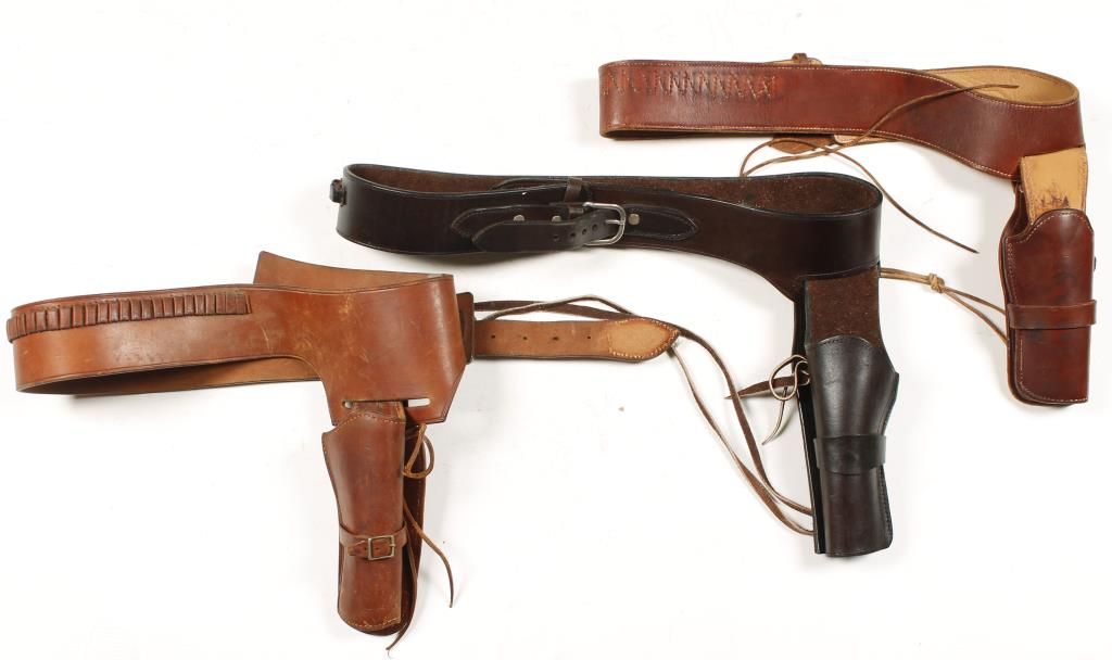 (1) Single holster rig, dark brown leather, with cartridge holders for (17) rounds. For .44 caliber. Made in Mexico. Size 44. (1) Viking single holster rig. Brown leather with cartridge holders for (26) small rounds. (1) Buckheimer hoslter rig, brown leather.