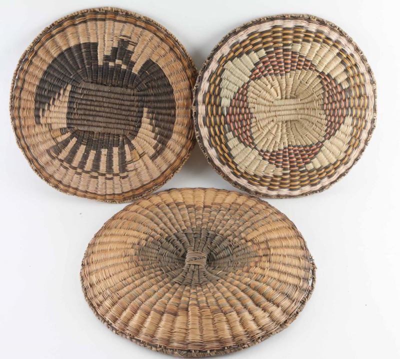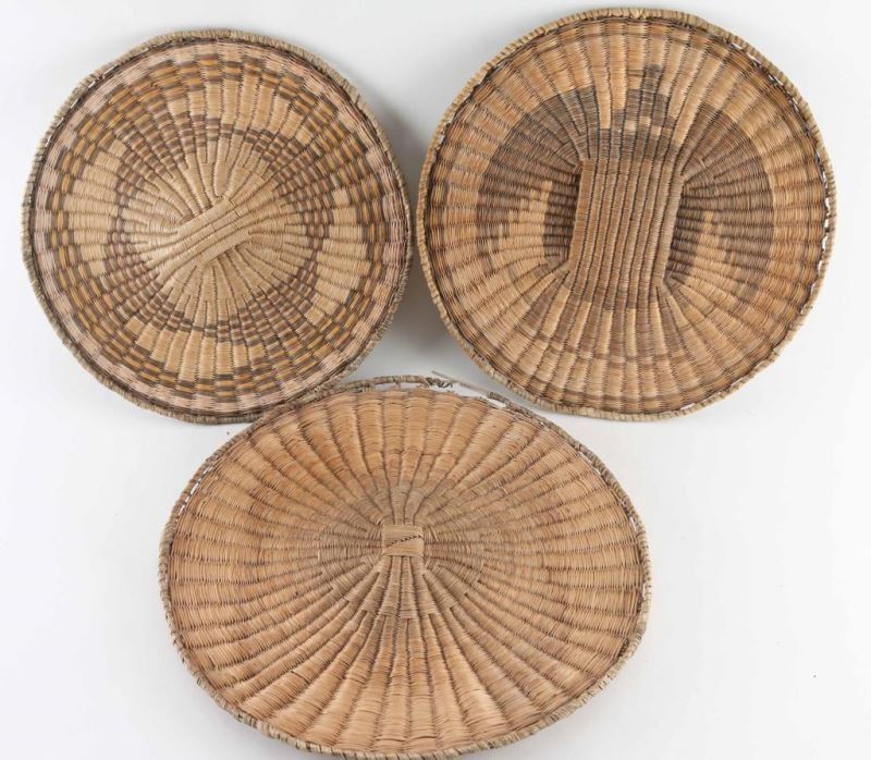 (1) Raven design basketry tray measures 13" diameter has some losses to the bottom (2) Other basketry trays14.5" losses to edge and other is 12" no losses.