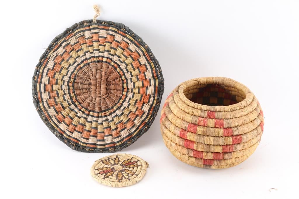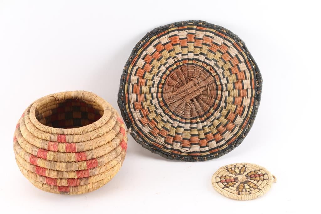 (1) Flat basket with orange, yellow, black design. Measures 9 3/4" diameter. (1) Bowl coil backet with red and brown design. Measures 5 3/4" and 4 3/4" across. (1) Yellow red and black design on small flat coil basket. Measures 4" in diameter.