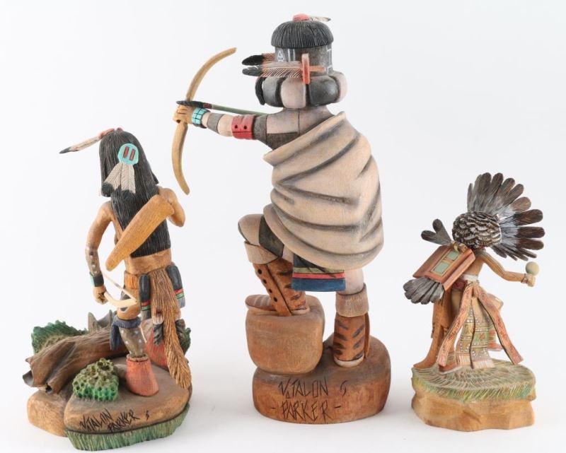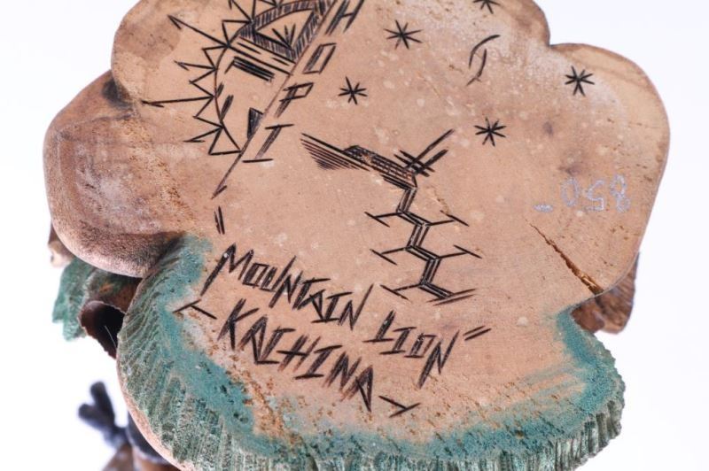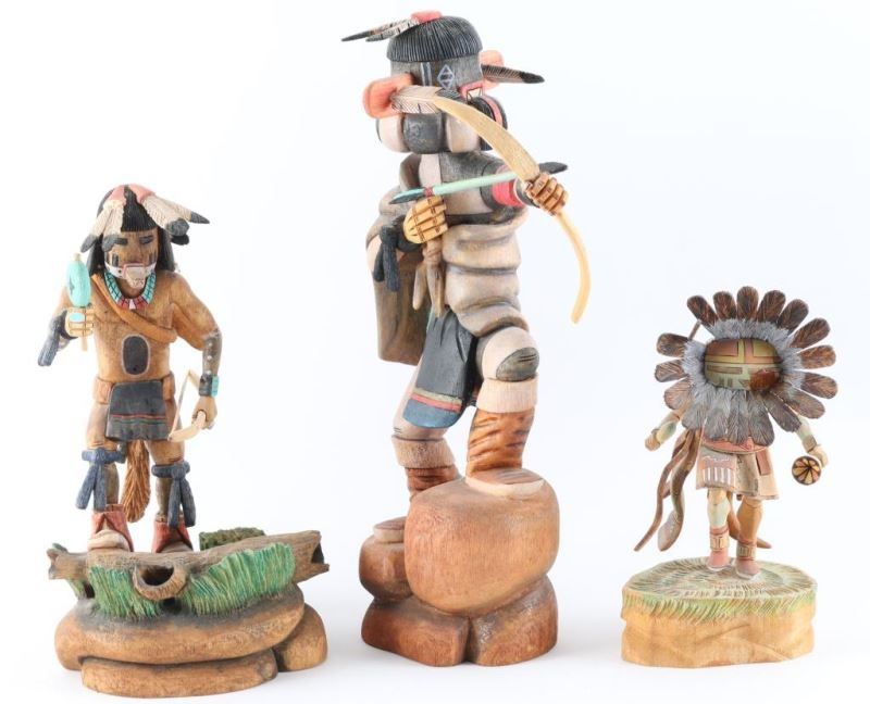 including 1 Archer Kachina, signed A I on base 11"x3" and. Hopi Kachina entitled Mountain Lion, 8"x4" and 3rd is signed Coolidge Roy Jr 7"x3". Appears to have been repaired and is missing feathers