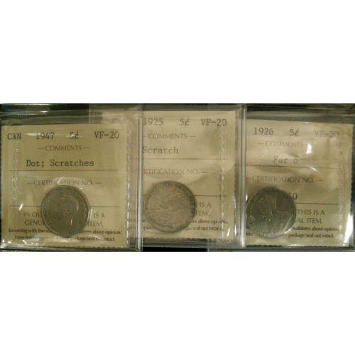 Lot of 3 ICCS Five Cents; 1925 VF-20 scrts, 1926 Far 6 VF-20, 1947 Dot VF-20 scrts.