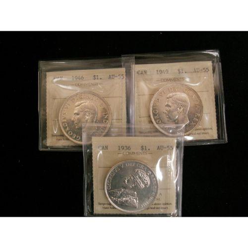 Lot of 3 ICCS graded $1 ;1936 AU-55, 1946 AU-55, 1949 AU-55,