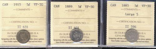 Lot of 3 ICCS graded Five cents; 1885 Large 5, 1889, 1915. All VF30.