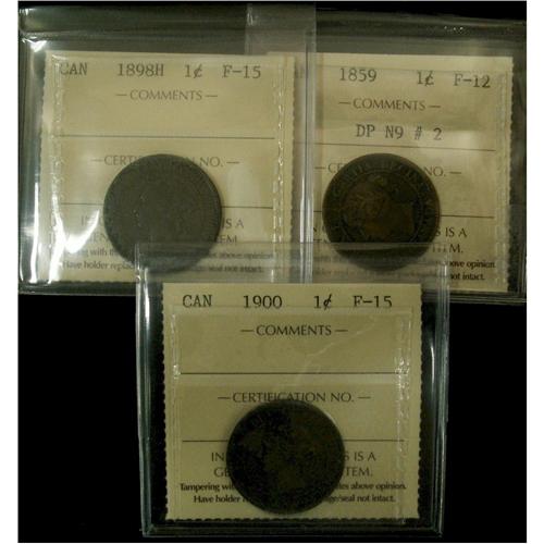Lot of 3 ICCS graded Large cents; 1859 DP#2 F-12, 1898H F-15, 1900 F-15