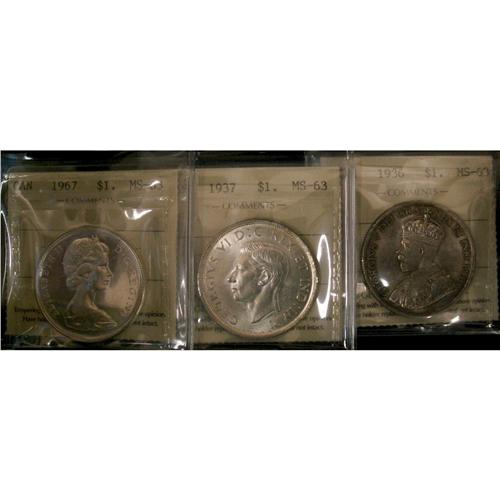 Lot of 3 ICCS graded MS-63 $1; 1936, 1937, 1967
