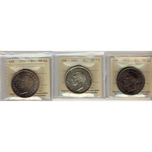 Lot of 3 ICCS graded MS-63 $1; 1937, 1951, 19