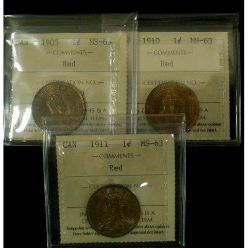 Lot of 3 ICCS graded MS-63 RED Large cents; 1905, 1910, 1911. Nice coins