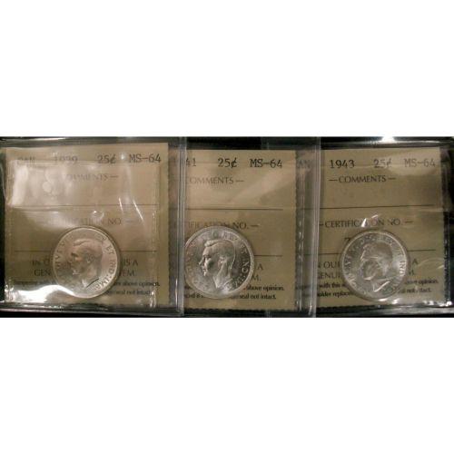 Lot of 3 ICCS graded MS-64 25¢; 1939, 1941, 1