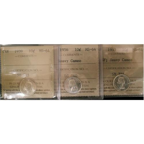 Lot of 3 ICCS graded MS-64 Ten Cents; 1939, 1953 SF HEAVY CAMEO, 1956 HEAVY CAMEO