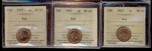 Lot of 3 ICCS graded Small cents; 1943 MS64 Red, 1967 MS64 Red, 1977 MS65 Red.