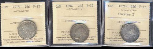 Lot of 3 ICCS graded Twenty-five cents;1871H Obv.2, 1894, 1915. All F12