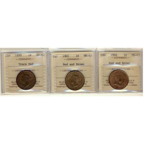 Lot of 3 ICCS graded large cents, 1899 MS-62 Trace Red, 1901 MS-63 RB,1902 MS-63 RB