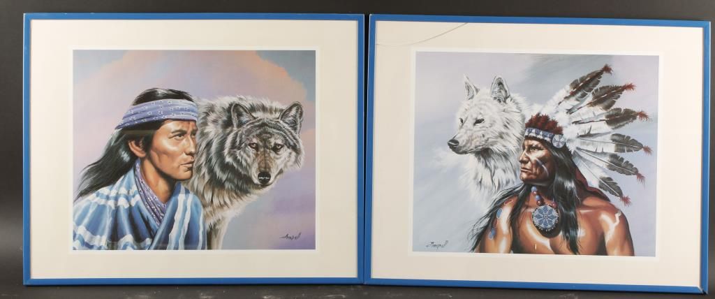 (2) Prints by Ampel of Indian braves and Wolves matching frames (1) Still life of Indian Pottery 1 print shows glass breakage in upper left corner.