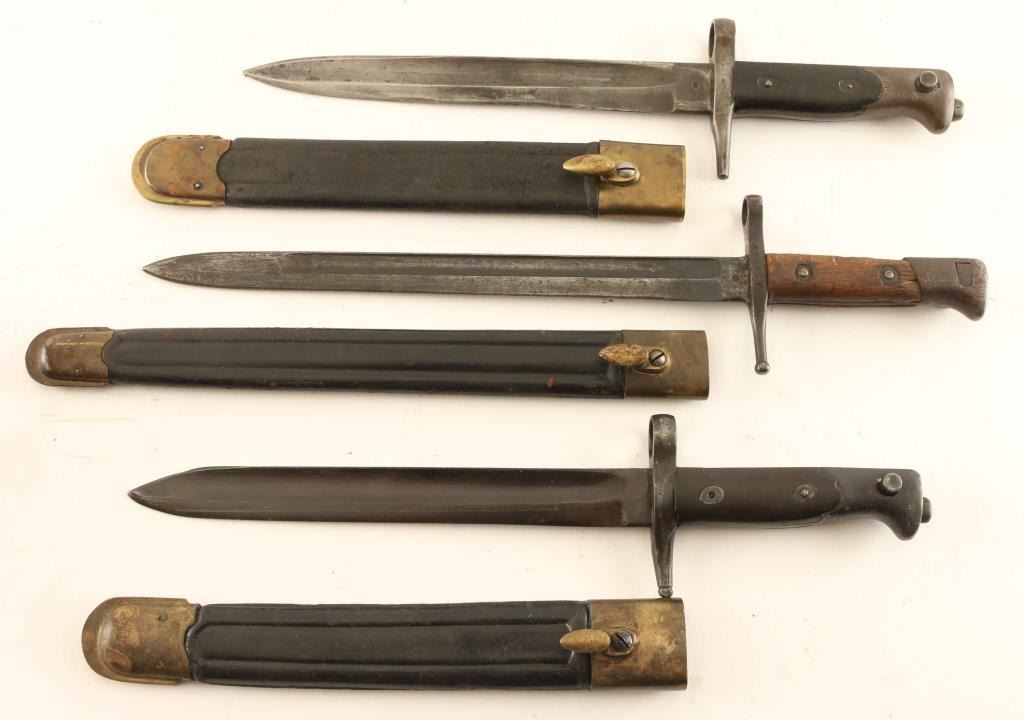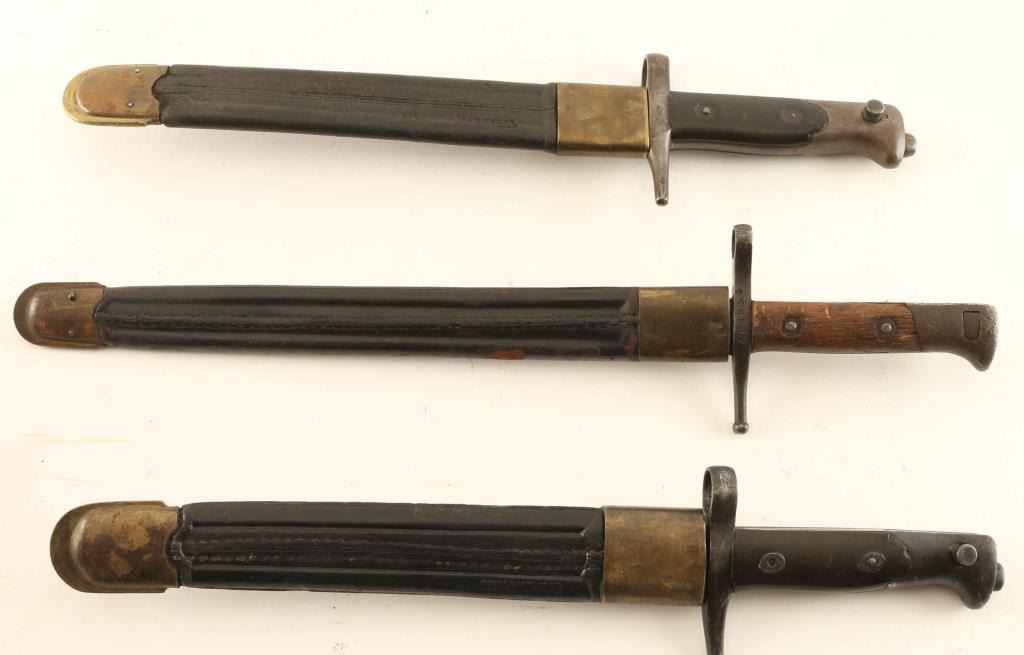 with brass fitted leather scabbards, two with 9" blade and one with 11" blade. Condition is fair.