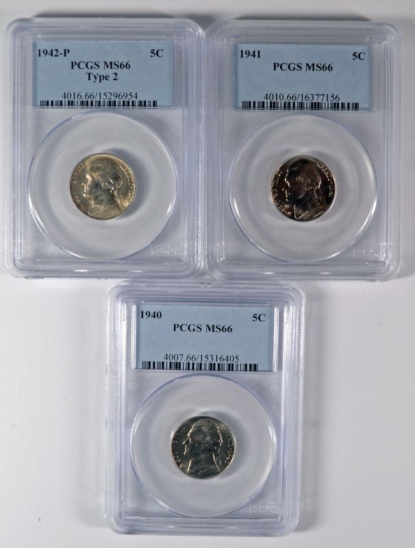 Lot of 3 Jefferson Nickels PCGS MS-66 1940, 41, 42-P Type 2